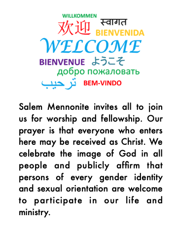 Salem Mennonite invites all to join us for worship and fellowship. Our prayer is that everyone who enters here may be received as Christ. We celebrate the image of God in all people and publicly affirm that persons of every gender identity and sexual orientation are welcome to participate in our life and ministry.